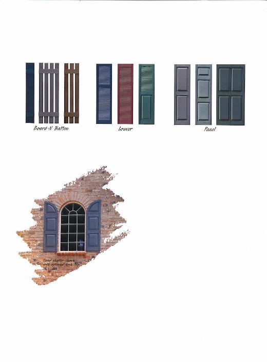 | Our shutters are manufactured from U.V. Stabilized polypropylene copolymer with molded-through color and are warrantied by the manufacturer for 40 years-including the finish! We also offer paintable shutters for the custom look. |