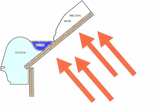 | ICE DAMS ICE DAMS ARE CAUSED BY THE ACCUMULATION OF HEAVY SNOW ON THE ROOF SURFACE. THERE ARE TWO FORCES AT WORK THAT CAUSE ICE DAMS. THE INSIDE HEAT OF YOUR HOUSE IS TRYING TO RISE AND BECOMES TRAPPED IN THE ATTIC SPACE HEATING THE ROOF BOARDS AND SHINGLES. THE TEMPERATURE OF THE OUTSIDE AIR IS KEEPING THE SNOW FROM MELTING WHEN BELOW FREEZING. |
